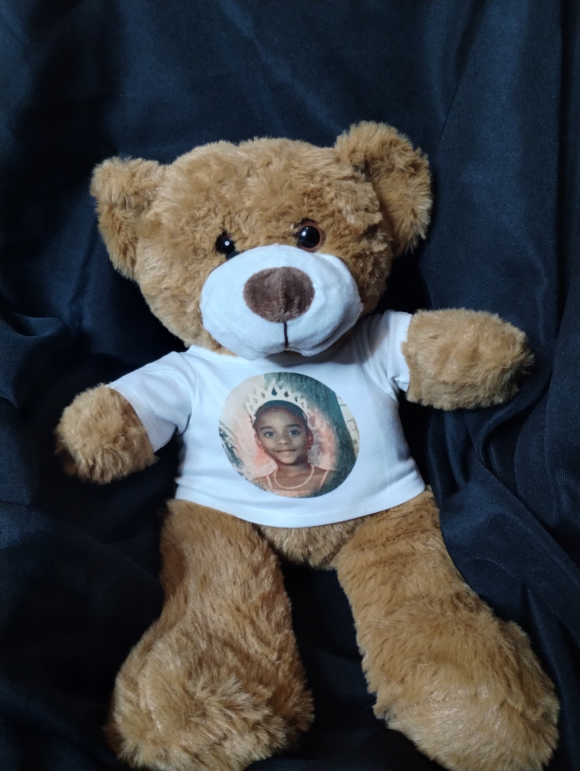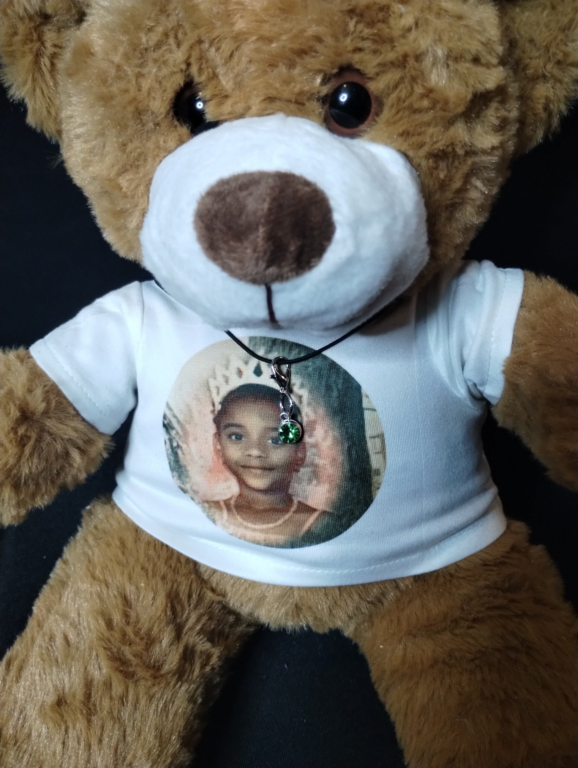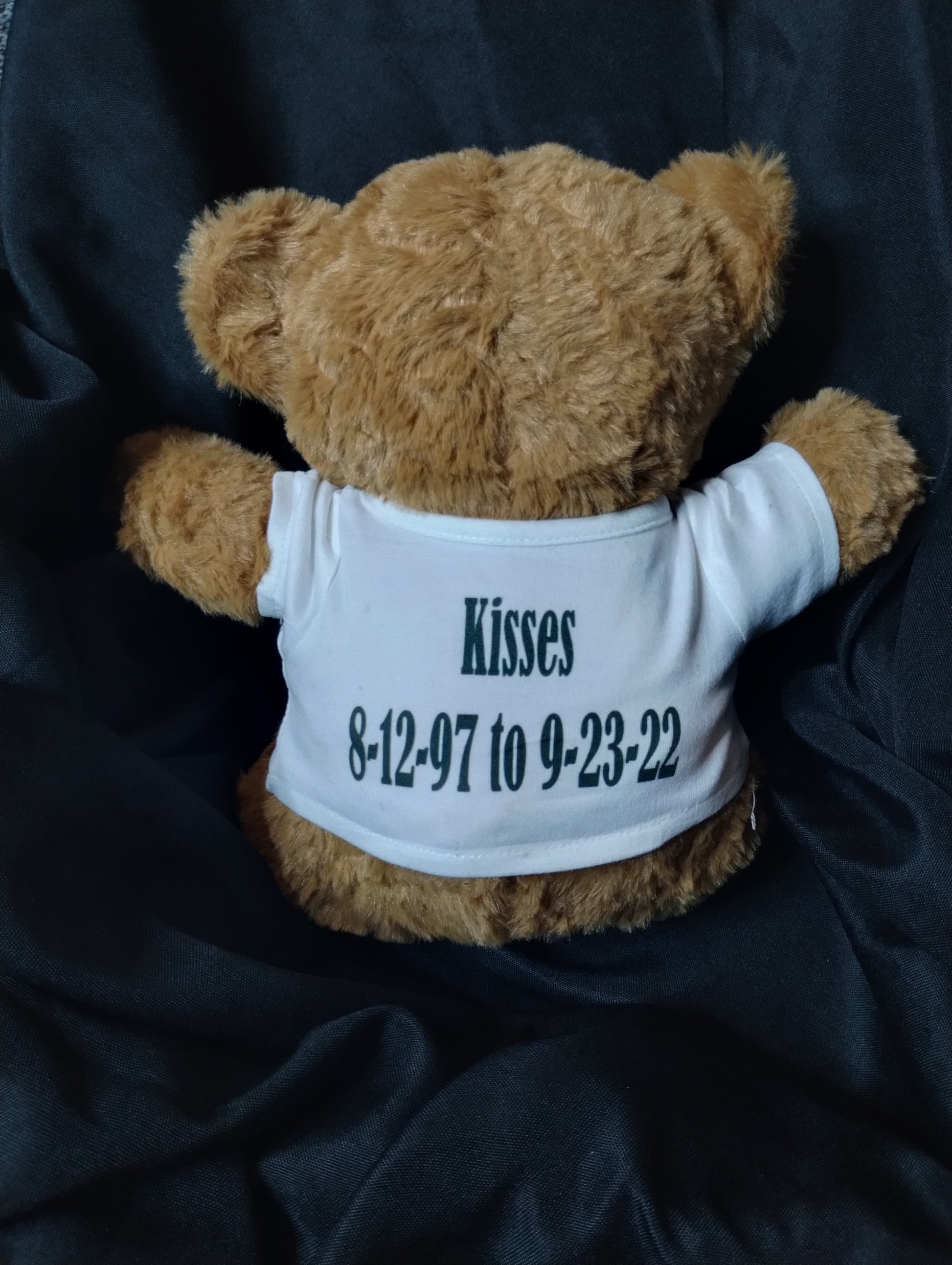This plush bear features a classic brown coat, an adorable friendly face, and a white shirt with your loved ones face on the front and sunrise and sunset on the back along with their name. Making it a beautiful and thoughtful tribute for someone at any age. Personalize the teddy bear t- shirt with custom touches such as names, dates or a few sweet words to keep your loved one's memory close. Every bear includes a unique memorial keychain with your loved ones birthstone attached and a affirmation letter from this SMK team.