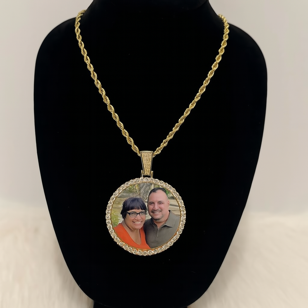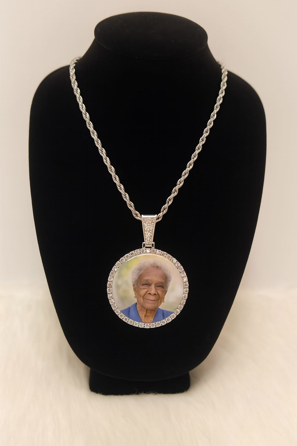 This elegant memorial necklace is a beautiful way to keep your loved one close to your heart. Featuring a delicate pendant that can be personalized with a photo, name, or meaningful message, it serves as a touching tribute and daily reminder of the bond you’ll always share. Crafted with care to honor those who are forever remembered. This is a 2.5 inch round silver or gold plated necklace encased and rhinestones with a rhinestone bezel. It comes with a 24-in stainless steel rope chain. Please feel free to upload more than one photo and text. Disclaimer: the quality of the photo or photos may affect the final outcome of the product.